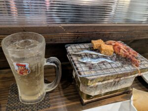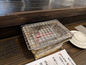 お通しの「厚揚げ」「小いか」「かぼちゃ」「エイヒレ」「がらんつ」を自分で炙って食べるスタイルで、食事の始まりからワクワクしました。