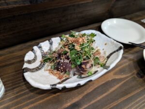 「カツオの森」はたっぷりの香味野菜と一緒にカツオのたたきがタレで和えられていてさっぱりと食べられました。