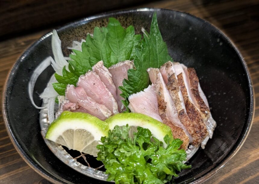 「種子島の首折れサバの刺身と炙り刺しの食べ比べ」は、刺身はコリっとした食感、炙りは柔らかく、味の変化が楽しめます。