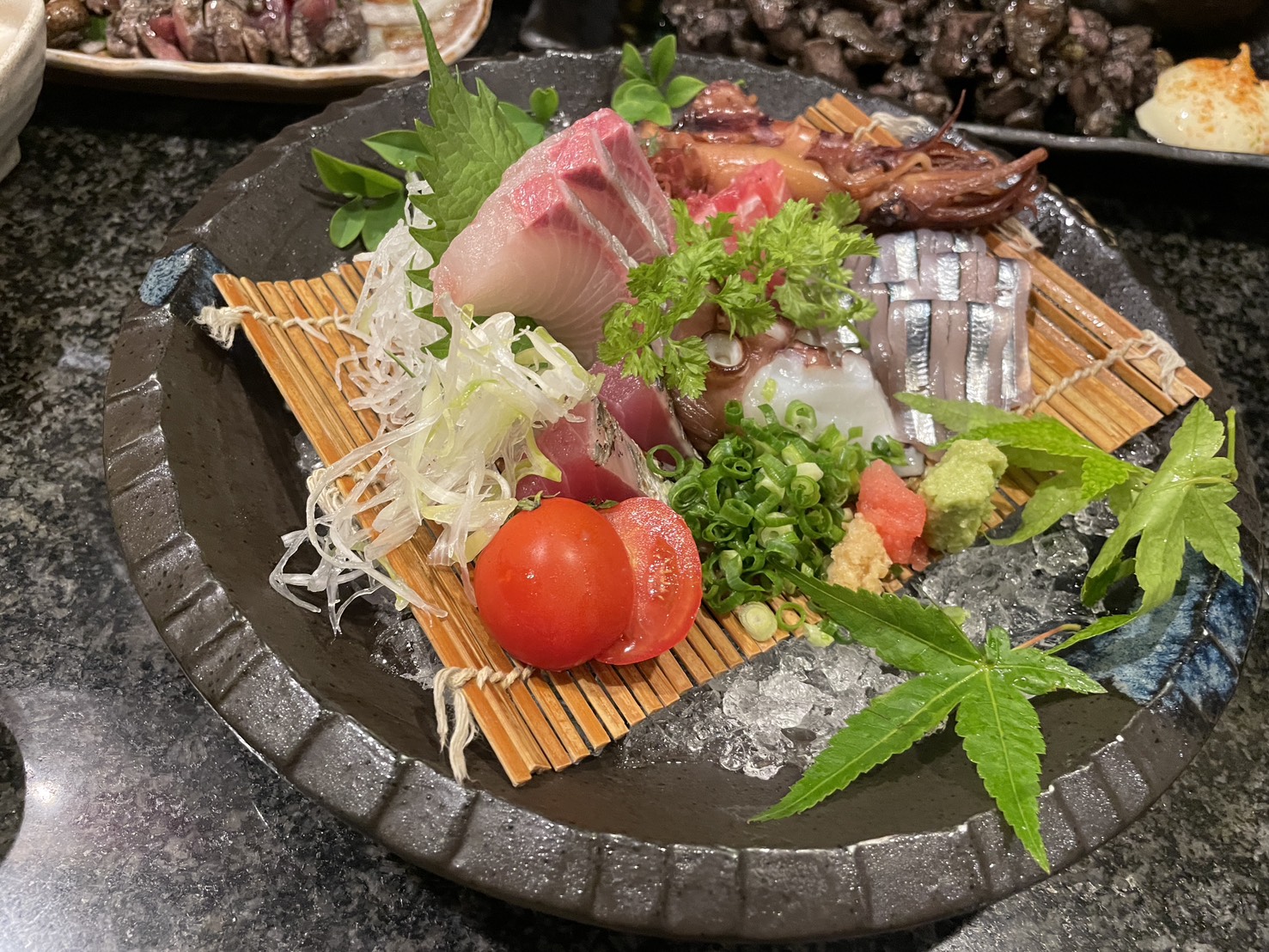 お酒と一緒に楽しむなら、お造り5種盛り(1,600円)もおすすめ。カンパチ、鰹、タコ、キビナゴ、イカが並び、どれも新鮮で、口の中で広がる旨味に驚きます。これらの魚介類と一緒に、赤鶏の炭焼きが引き立つこと間違いなしです。