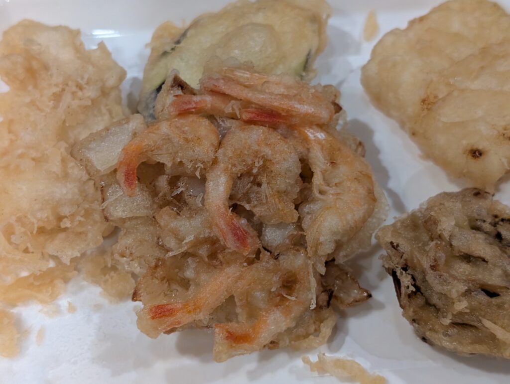 最初に海老、舞茸、鶏、インゲン、茄子、玉ねぎの天ぷらが提供され、しばらくして揚げたての海老のかき揚げが登場。