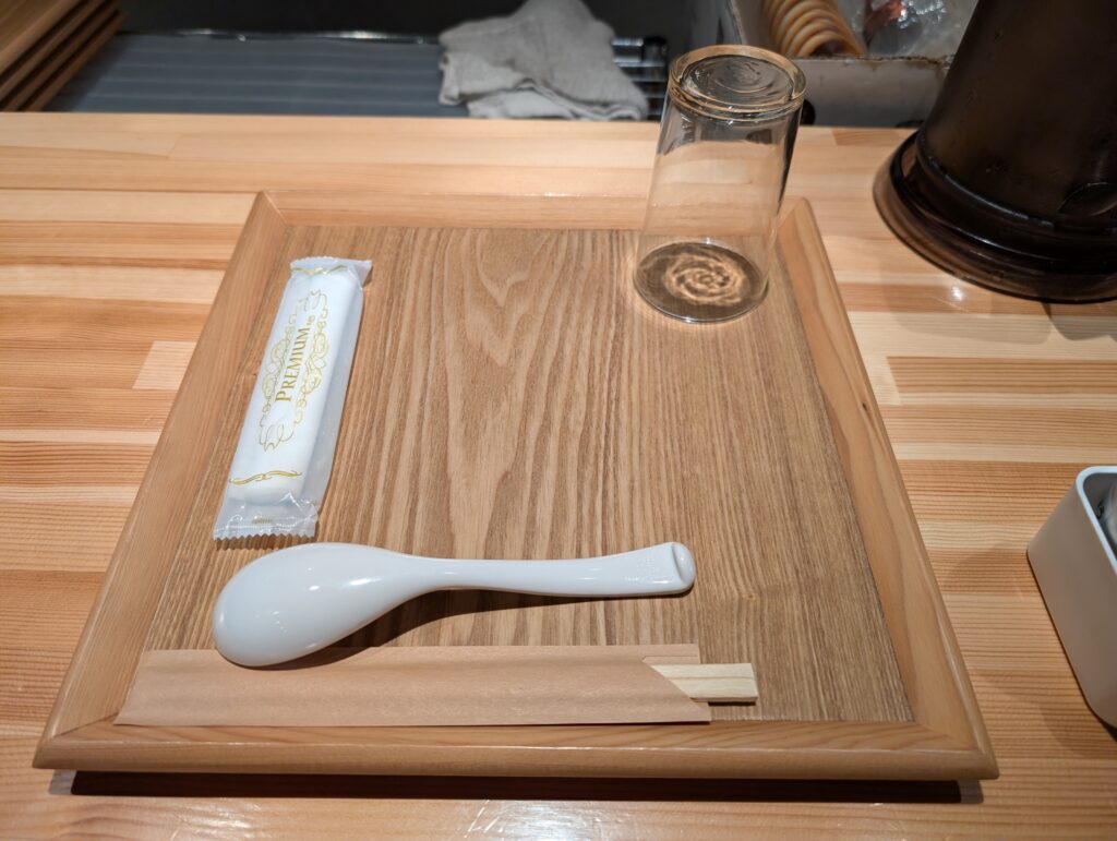 店内は清潔感があり、おしゃれなカフェやバーのようでありながら木の温もりも感じられる落ち着いた雰囲気。レンゲや箸、コップ、お手拭きがあらかじめお盆にセットされており、細やかな気配りが感じられます。