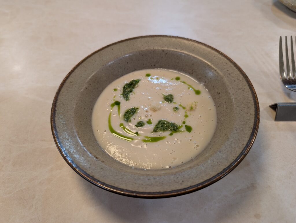 この日のポタージュは蕪のポタージュ。バジルオイルがアクセントになり、あっさりしながらも印象に残る味わいでした。