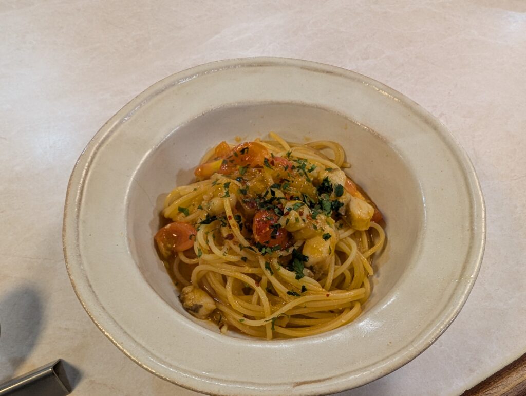 今月のおすすめ:白身魚とトマト 冬のオイルパスタは、魚介の旨味とトマトの酸味のバランスが絶妙。具材も豊富で、白身魚にはアンコウを使用。パスタでアンコウを味わうのは初めてでしたが、意外性と美味しさに驚かされました。
