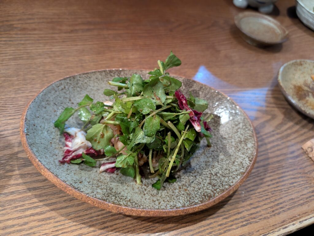 鹿児島らしさを感じる一品で、柔らかな鶏のタタキと、シャキシャキ食感のクレソンが好相性。生姜醤油ドレッシングが素材の美味しさを引き立てています。