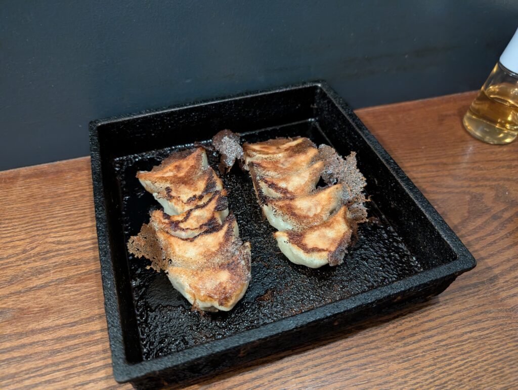 熱々の鉄板で提供される餃子は、羽根がパリパリ。しっかりとした皮の中には具がたっぷり詰まっており、肉の旨味をしっかり感じられますがしつこくなくさっぱりした味わい。