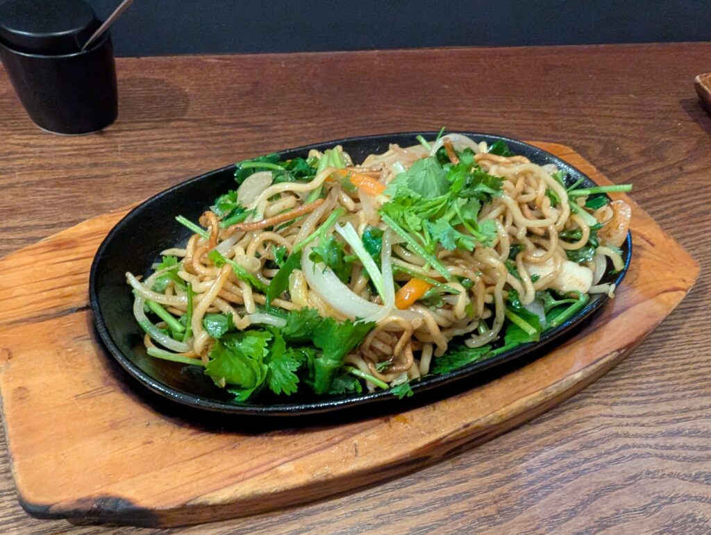 海鮮や野菜がたっぷり入った塩焼きそばに、パクチーとレモンを添えた一皿。そのままでも美味しいですが、パクチーとレモンを混ぜることで爽やかさが加わり、パクチー好きにはたまらない味になります。