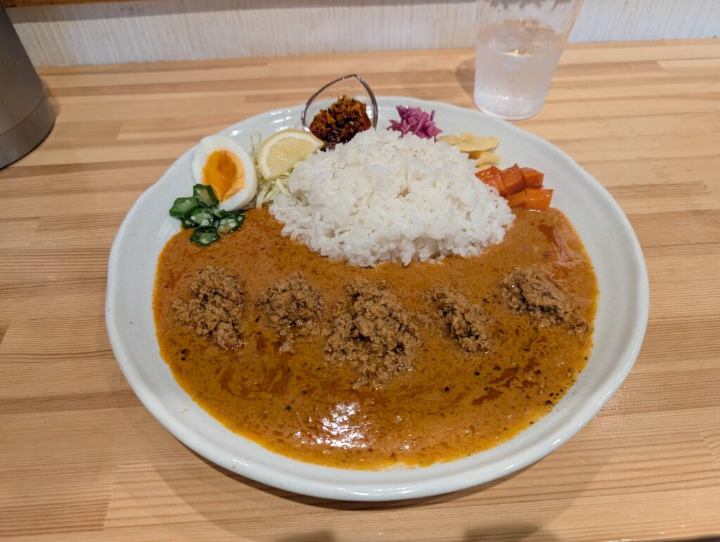 キーマカレーは盛り付けが美しく、見た目から食欲をそそります。人参、レンコン、紫キャベツ、キャベツ、ゆで卵が彩りよくトッピングされ、まるでサラダとカレーを一緒に楽しんでいるような一皿。