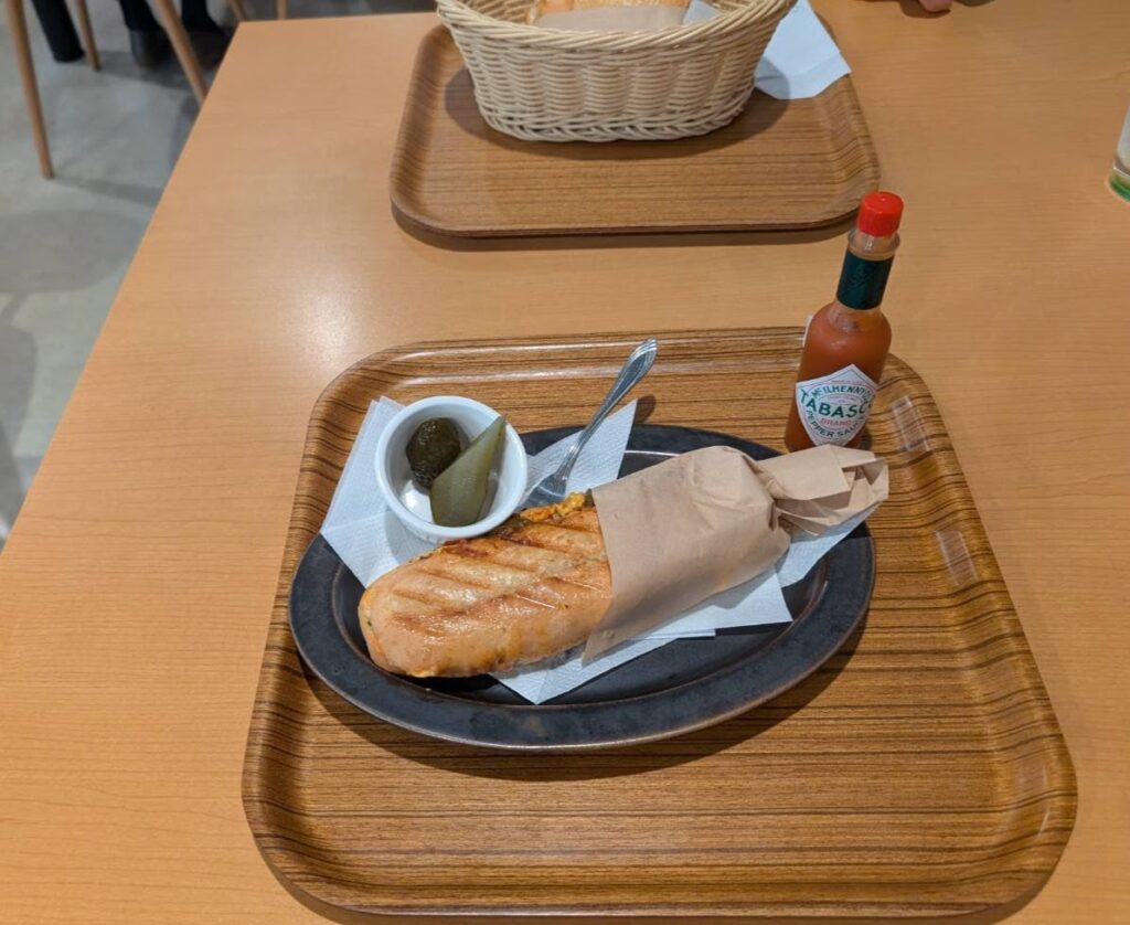 パリッと焼かれたパンに、厚切りベーコンとチーズが挟まれ、ハラペーニョやスパイスの効いたエスニックな風味が印象的。軽食ながら食べ応えがあります。