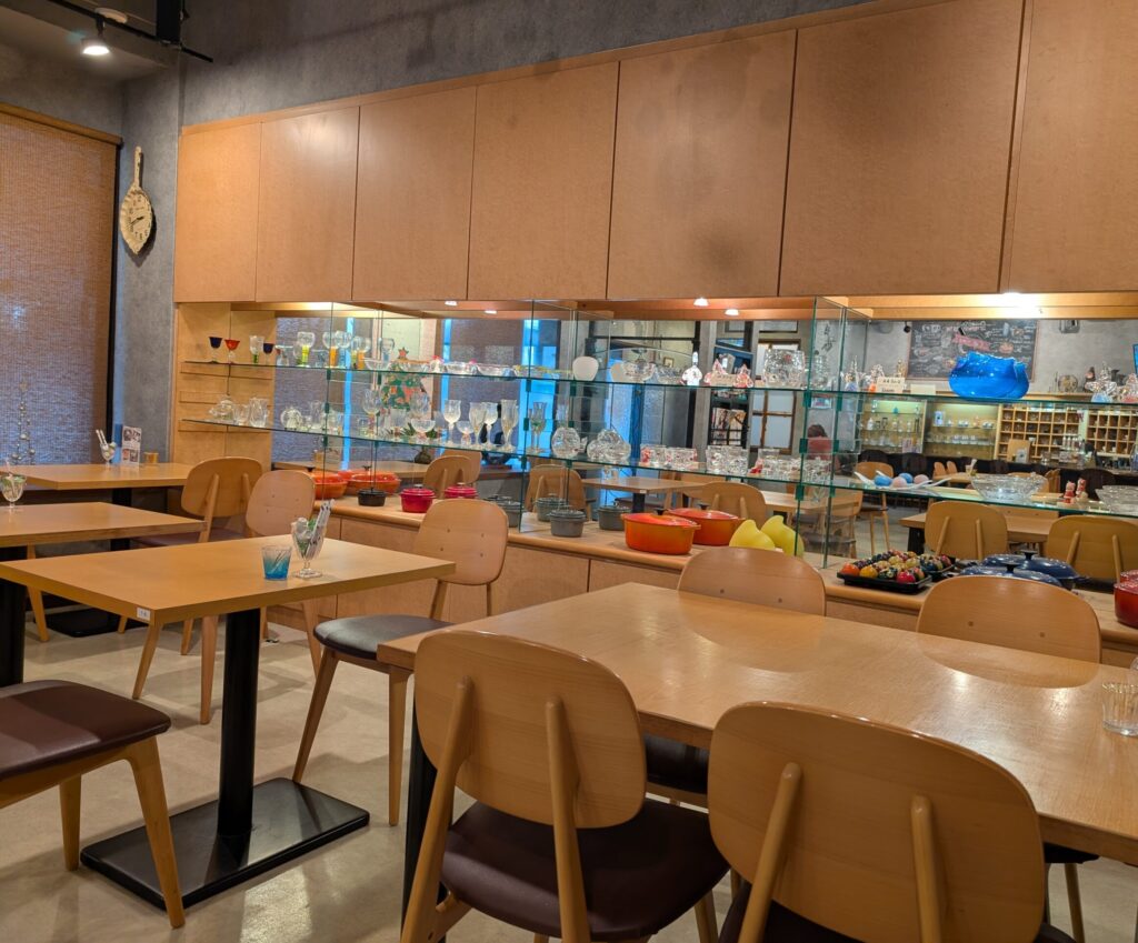 店内にはグラスギャラリー時代の名残として、美しいグラスが並び、さりげない個性を感じられる空間です。