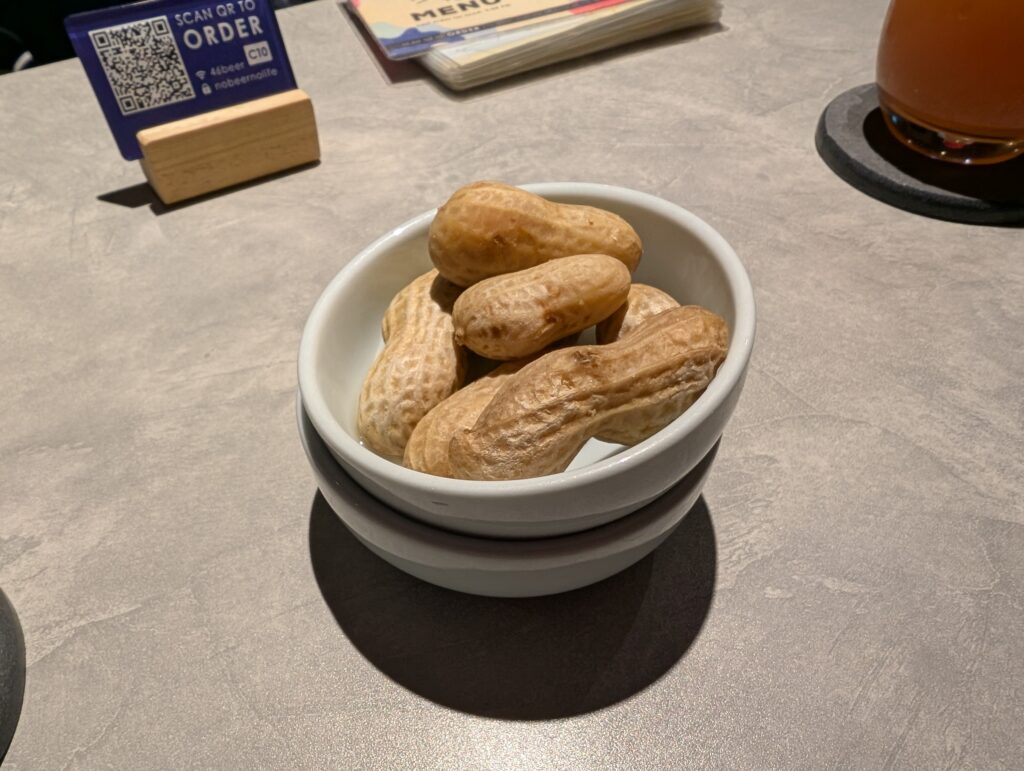 フードでは、大きな塩茹で落花生を注文。吹上町で栽培された「オオマサリ」を使っており、濃厚な味わいでビールとの相性も抜群でした。