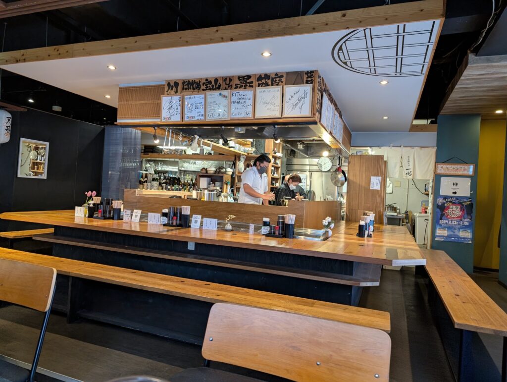 店内はカウンター席とテーブル席の両方が用意され、全体的にゆとりのある配置。落ち着いた雰囲気の中で食事が楽しめます。