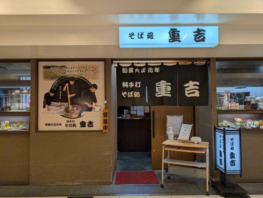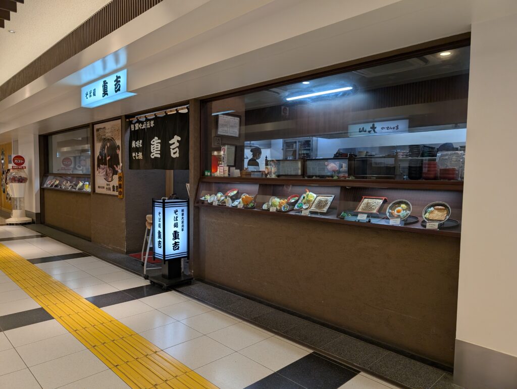 「そば処 重吉」は鹿児島中央駅の新幹線・在来線改札から徒歩1分ほどと非常にアクセスが良く、移動の合間でも気軽に立ち寄れるのが魅力です。