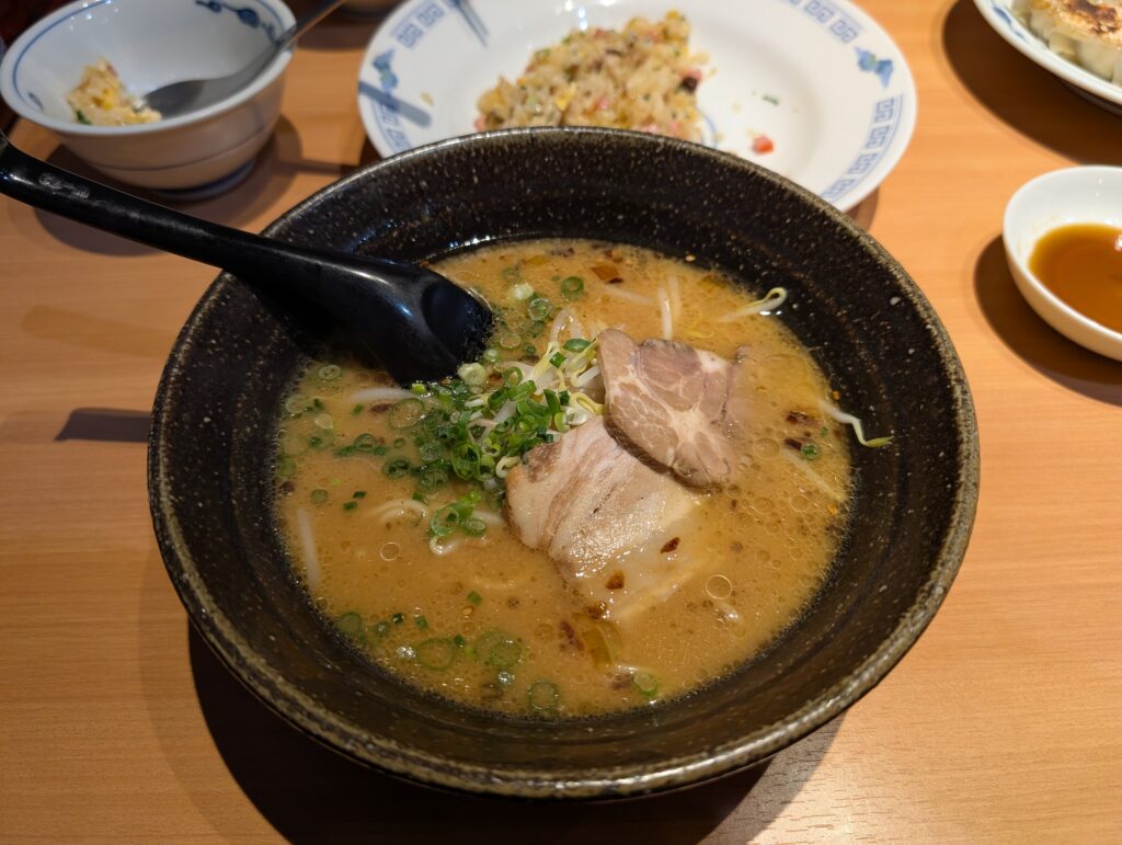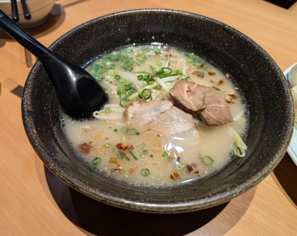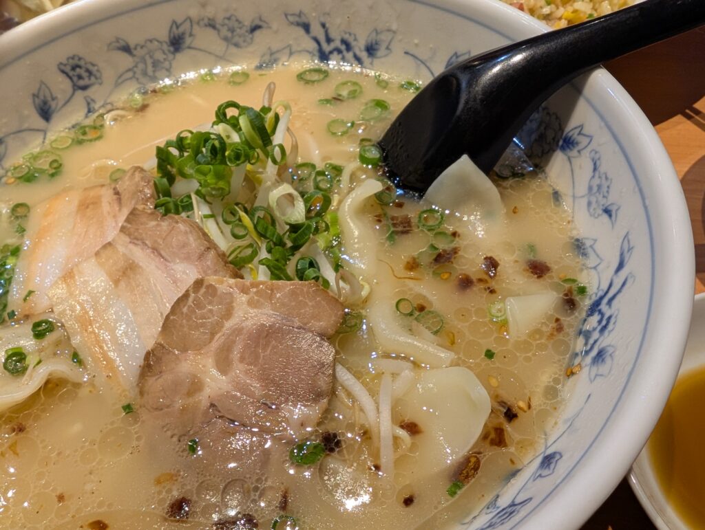 ラーメン(今回は小サイズ)は、鶏ガラと豚骨をベースにした鹿児島らしい優しい味わい。コクはありつつも重すぎず、スープまで飲み干したくなる仕上がりです。鹿児島ラーメンらしいトッピングのシャキシャキのもやしや香ばしい焦がしネギが良いアクセントになっています。